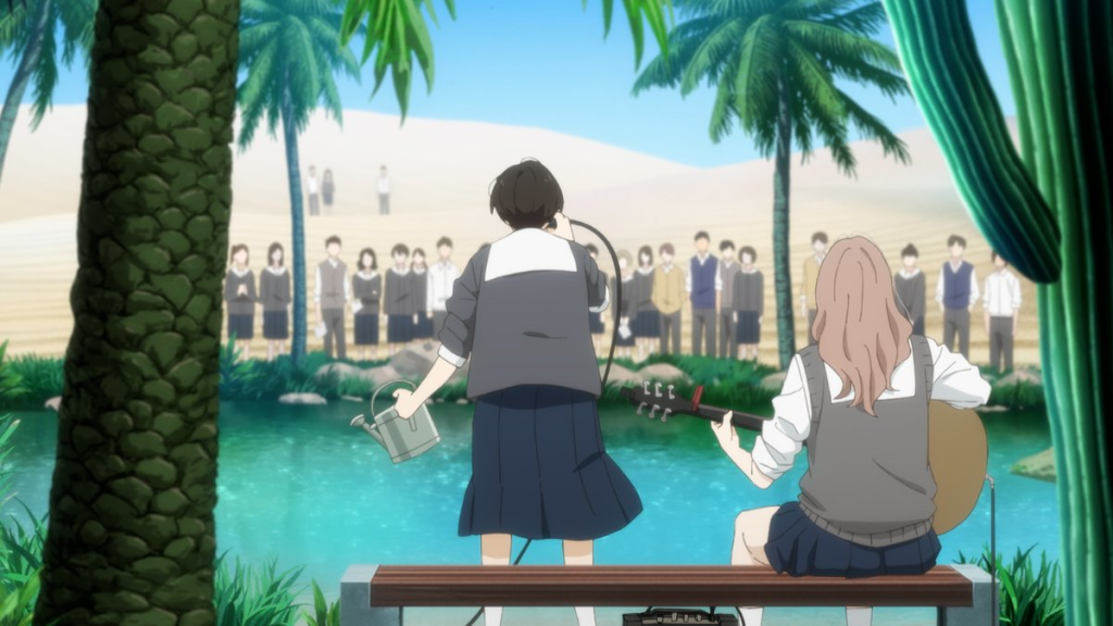 The writing of this series is done in a way where it’s subtle, combined with the imagery tells a story that isn’t in your face, but beautifully blends in with what they want to convey. One example and a defining one was Emiri dealing with her sexuality, where she came over to Asa’s house and Makio having an inkling that Emiri was dealing with her sexuality, recommended her a film. The scene of this does not explicitly show the actual title of the film, but it just shows the film titled “Tomatoes”. I initially had no idea what this was in reference to, but after searching, it referenced the movie “Fried Green Tomatoes”, which touches on the relationship of same sex relationships. I have not watched this film, and just basing it off a summary I have read! So excuse me if I’m wrong!